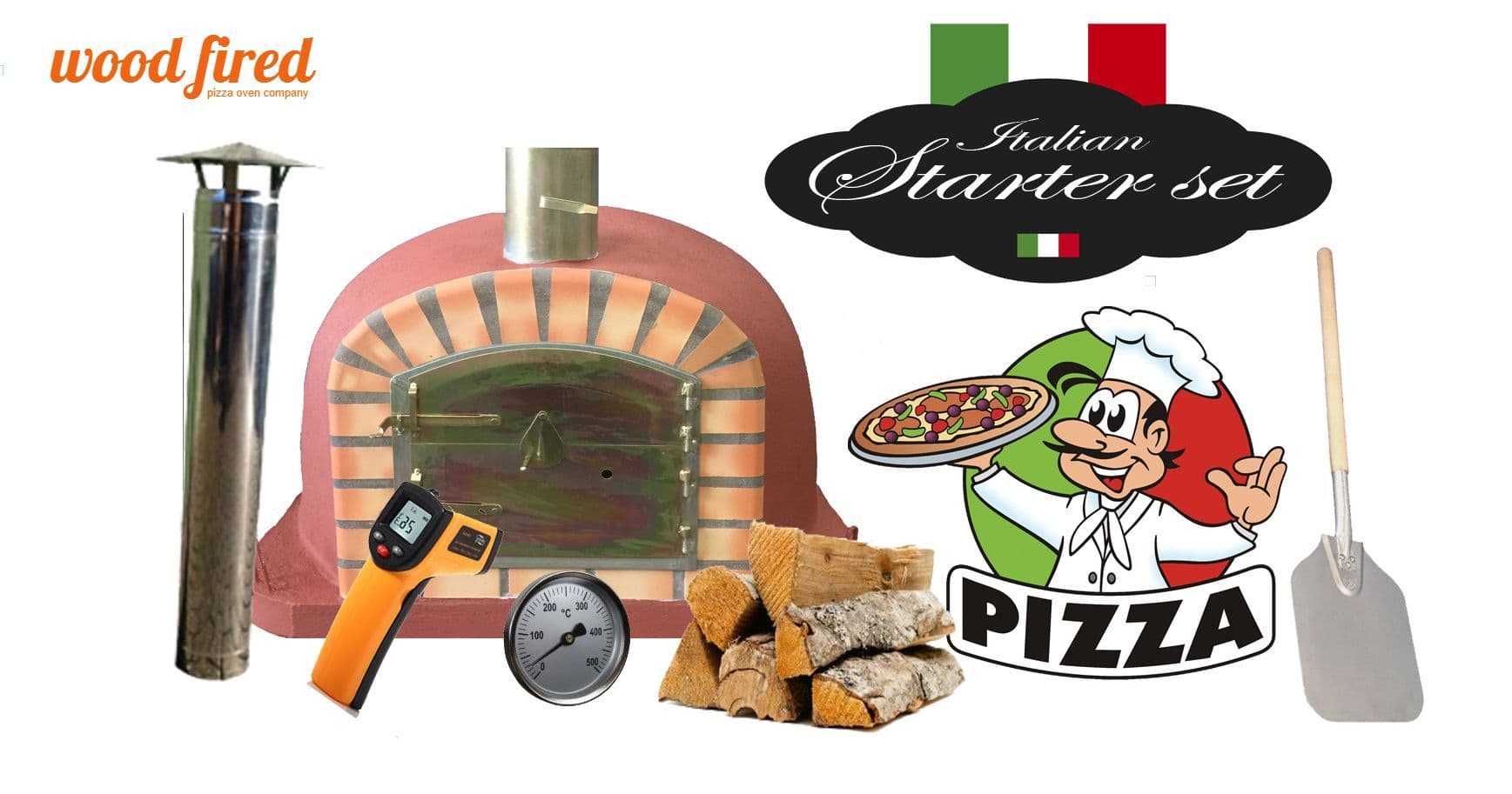 BRICK RED DELUXE EXTRA WOOD FIRED PIZZA OVEN STARTERKIT 70CM-120CM, ORANGE ARCH, GOLD DOOR